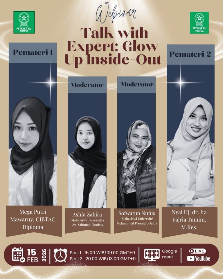 Dengan tema Glow Up Inside-Out, pada hari Ahad (15/02/2026)—Bidang Pendidikan dan Dakwah PCI Fatayat NU Maroko berkolaborasi dengan PCI Fatayat NU Tunisia mengadakan webinar yang diberi nama Talk with Expert via Zoom Meeting. Seperti namanya, Talk with Expert ini menghadirkan dua pemateri yang expert dalam bidangnya dengan dua sesi yang terpisah. Pada sesi pertama, dengan…