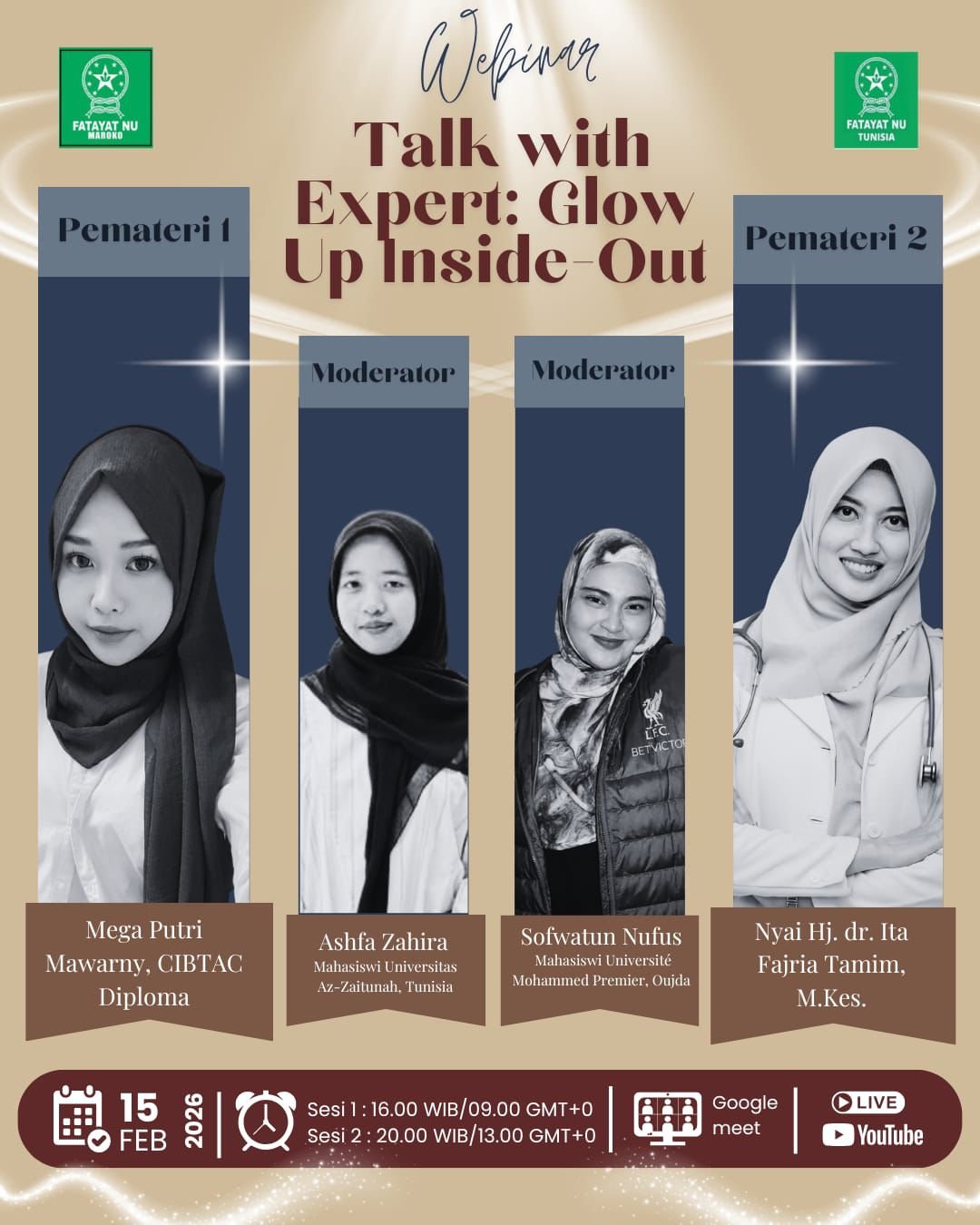 Dengan tema Glow Up Inside-Out, pada hari Ahad (15/02/2026)—Bidang Pendidikan dan Dakwah PCI Fatayat NU Maroko berkolaborasi dengan PCI Fatayat NU Tunisia mengadakan webinar yang diberi nama Talk with Expert via Zoom Meeting. Seperti namanya, Talk with Expert ini menghadirkan dua pemateri yang expert dalam bidangnya dengan dua sesi yang terpisah. Pada sesi pertama, dengan pembahasan glow up outside, webinar ini menghadirkan Kak Mega Putri Mawarny yang merupakan seorang makeup artist bersertifikat CIBTAC dengan spesialisasi bidang fotografi dan fashion makeup. Pada sesi kedua, Nyai. dr. Ita Fajria Tamim, M.Kes., seorang expert dalam kesehatan mental, hadir sebagai pemateri untuk melengkapi pembahasan glow up inside.